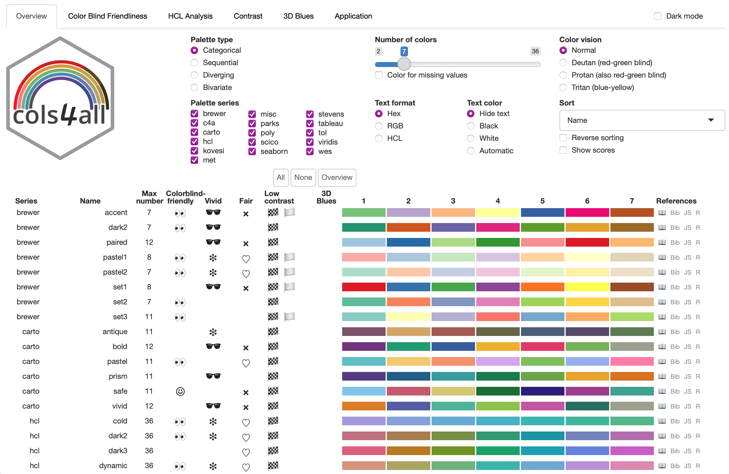 paletteer (Hvitfeldt, 2021) combine 2587 palettescols4all (Tennekes, 2023) propose une app shiny :