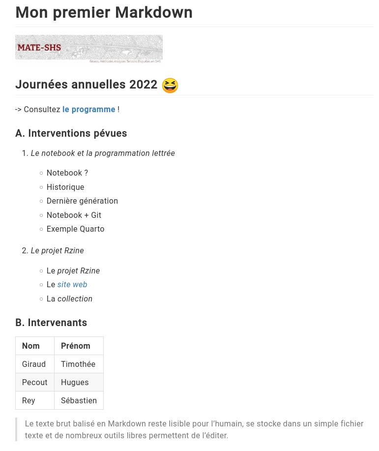 > Le texte brut balisé en Markdown reste lisible pour l'humain, se stocke dans un simple fichier texte et de nombreux outils libres permettent de l'éditer.-> Visualiser sur HackMD